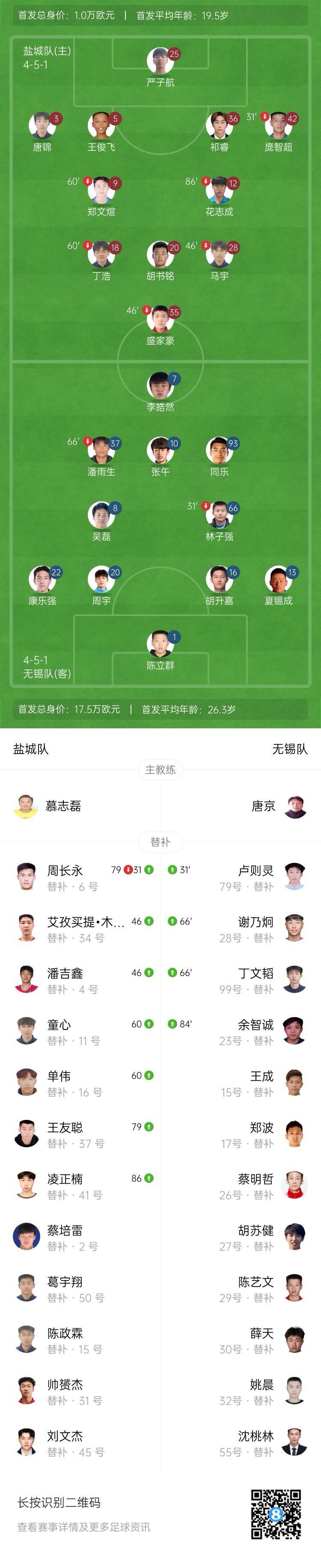 第11分钟,客场作战的无锡队取得领先,吴磊前场完成抢断后传至禁区,林子强头球破门,无锡队1-0领先盐城队,这也是盐城队首次主场丢球。↓